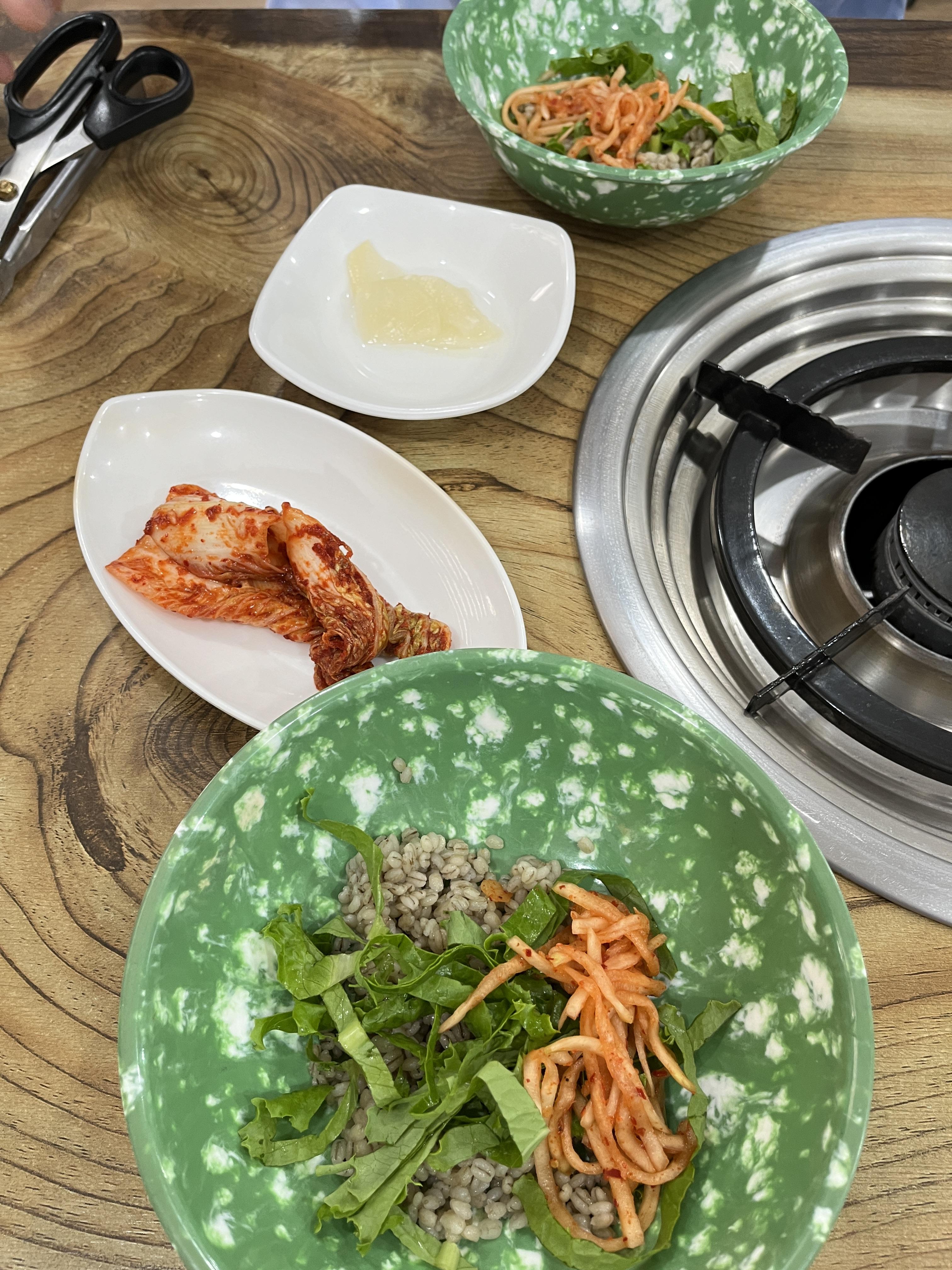 들어오면 기본 상차림이 김치와 단무지, 보리비빔밥을 작게 내어 줍니다.